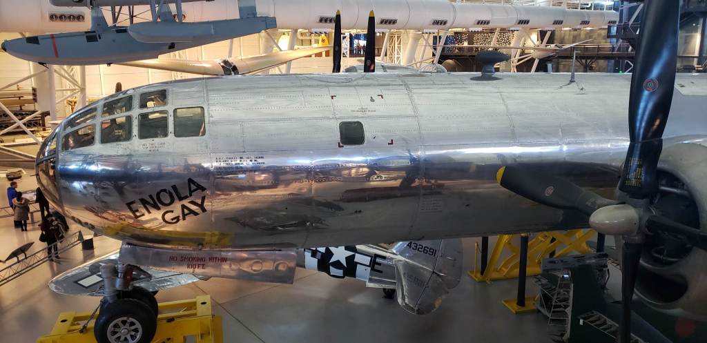 “In the 1980s, veterans groups engaged in a call for the Smithsonian to put the aircraft on display, leading to an acrimonious debate about exhibiting the aircraft without a proper historical context. The cockpit and nose section of the aircraft were exhibited at the National Air and Space Museum (NASM) on the National Mall, for the bombing’s 50th anniversary in 1995, amid controversy. Since 2003, the entire restored B-29 has been on display at NASM’s Steven F. Udvar-Hazy Center. The last survivor of its crew, Theodore Van Kirk, died on 28 July 2014 at the age of 93.”